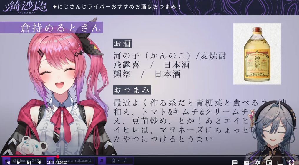 綺沙良さんが2024年10月25日に【にじさんじライバーに聞いた!お酒&おつまみオススメ特集】という配信をしていました。