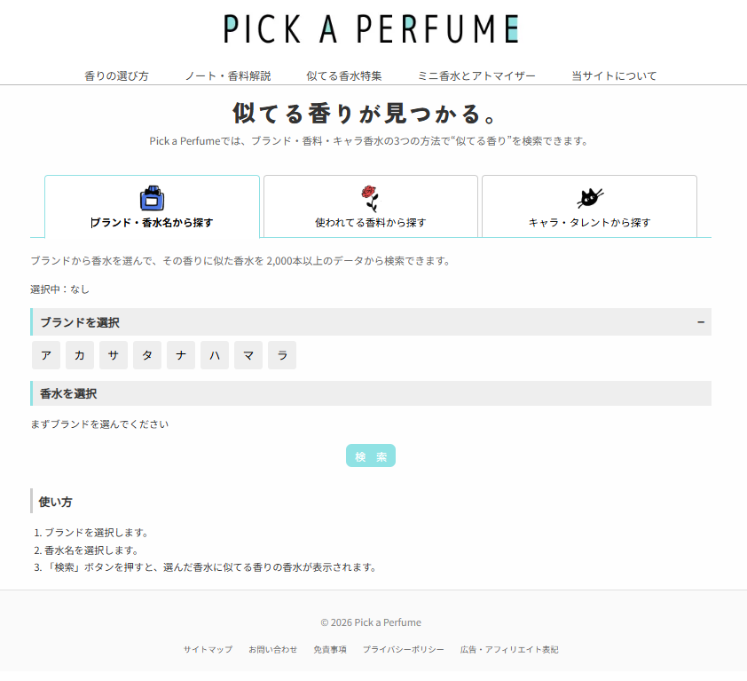 さらに、約2,000種のブランド香水の中から選んで似てる香水を探せる機能や、タレント・キャラ名から香水を選択して似てる香水を探せる機能があります。気になった方は是非使ってみてください。